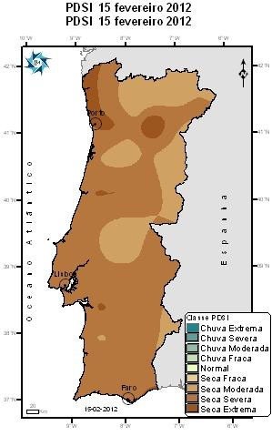 Em 15 de Fevereiro de 2012, de acordo com o o índice de seca meteorológica PDSI, situação de seca agravou-se em termos de intensidade estando agora 75% do território nas classes de seca severa e extrema.