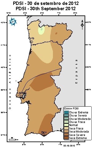 No final de setembro 2012 a situação de seca meteorológica em Portugal Continental mantém-se, mas verifica-se em relação a 31 de agosto um desagravamento da intensidade de seca meteorológica em todo o território do Continente, desaparecendo a seca extrema e diminuindo significativamente a seca severa, estando agora quase todo o território na situação de seca fraca a moderada. Assim no final do mês tem-se: 15% do território em seca severa, 65% em seca moderada, 19% em seca fraca e 1% na situação normal (nota: a área que aparece no mapa com a classe de “chuva fraca” corresponde a apenas 0.1% do território).