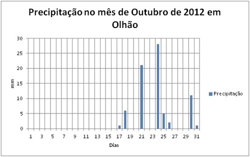 Quanto à precipitação de notar que o mês de Outubro pode classificar-se como normal no Sotavento Algarvio e chuvoso no Barlavento Algarvio. A precipitação variou entre os 50.3 mm em Castro Marim e os 91.0 mm em Sagres.